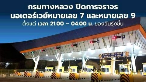 กรมทางหลวง ปิดการจราจร มอเตอร์เวย์หมายเลข 7 และหมายเลข 9 ตั้งแต่เวลา 21.00-04.00 เริ่มพรุ่งนี้