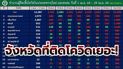 ตารางการติดเชื้อ 77 จังหวัด ตั้งแต่ 1-24 เม.ย.64