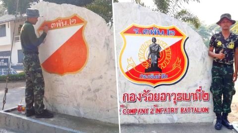 ฝีมือผมเอง เป็นทหารของชาติด้วยความภูมิใจ ทำป้ายหน่วยกองพันฯ บนแผ่นหินขนาดใหญ่