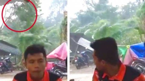 หนุ่มหิวจัด!! นั่งโซ้ยมื้อเย็นจนลืมพายุข้างหลัง ต้นไม้ล้มก็ยังไม่ยอมลุก