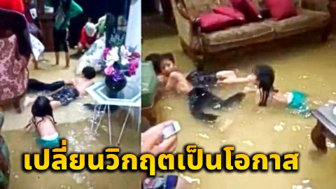 ครอบครัวเจอฝนถล่มน้ำท่วมบ้านไม่หวั่น เด็กๆเปลี่ยนให้เป็นสระว่ายน้ำซะเลย