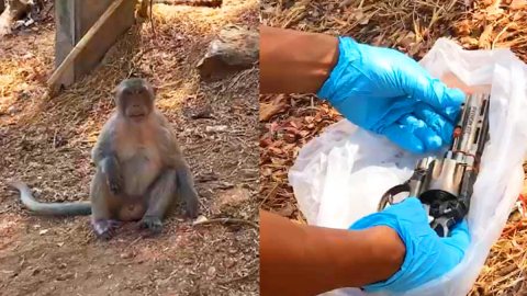 เจ้าจ๋อแสนซน หยิบปืนที่ซุกซ่อนไว้ในป่ามาเล่น ทำเอาพ่อค้าวิ่งหนีกระเจิง