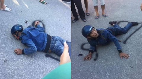 หนุ่มควบมอเตอร์ไซค์ชนรถบรรทุก นอนแน่นิ่ง ตำรวจเอาสเปรย์มาพ่นมาร์ค ลุกขึ้นมานั่งได้เฉยเลย ทำเอาตกใจกันหมด