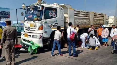 หญิงสาวขับขี่รถ จยย. ตัดหน้ารถบรรทุกพ่วง 22 ล้อ ก่อนถูกเหยียบทับร่าง ได้รับบาดเจ็บสาหัส