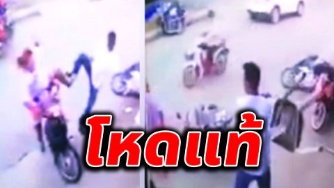 หนุ่มหัวร้อนกระโดดถีบ!! สาวที่ขับมอเตอร์ไซด์ที่มีเด็กนั้งมาด้วยจนกระเด็นล้ม ทั้งจับเก้าอี้จะฟาดซ้ำ