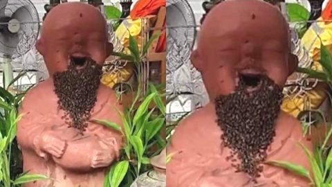 นักท่องเที่ยวแปลกใจ! ฝูงผึ้งรังมาเกาะตุ๊กตาดินเผาสามเณร จนดูคล้ายรูปปั้นมีหนวดเครา
