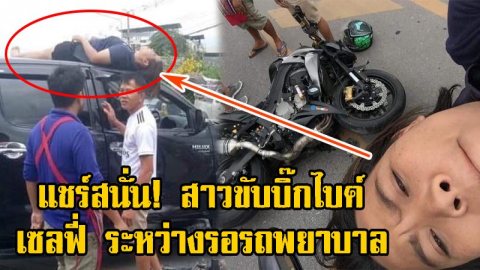 ถ่ายเป็นหลักฐาน!! สาวบิ๊กไบค์ กระเด็นขึ้นหลังคากระบะ นอนเซลฟี่รอรถพยาบาล