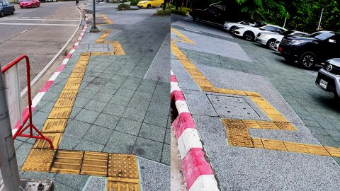 วิจารณ์ยับ นี่หรือฟุตบาทคนพิการ? เส้นนำทางยักย้ายส่ายไปมา จะให้คนตาบอดเต้นชะลาล่าหรือไง?