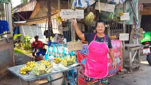ลูกค้าเเปลกใจ ป้าเเม่ค้าขายกล้วยทอดเเปะป้ายเต็มหน้าร้าน ผ่านไปมาต้องเเวะถามไถ่