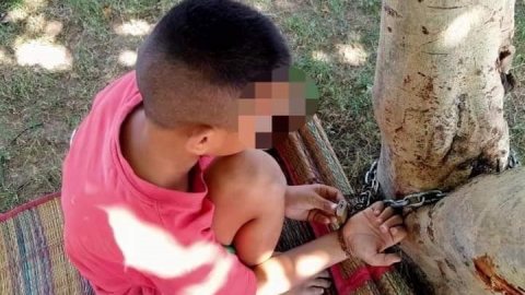 น่าเวทนา..เด็กชาย ถูกแม่จับล่ามโซ่ล็อคแม่กุญแจไว้กับต้นไม้ริมคลอง