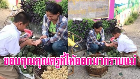 คุณครูตัดสินใจอนุญาตให้นักเรียนคนหนึ่งออกไปหน้าโรงเรียน และภาพที่ได้เห็นคือ เอาดอกไม้ไปกราบแม่ที่กำลังหาบเร่ขายของ