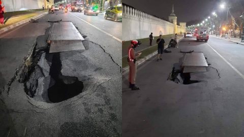 หลุมใหญ่มาก!! หน้าวัดพระแก้ว ทางก่อสร้างทรุด