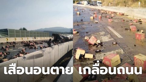 สลด!! เกิดอุบัติเหตุรถบรรทุกพลิกคว่ำ เสือนอนตาย เกลื่อนถนน
