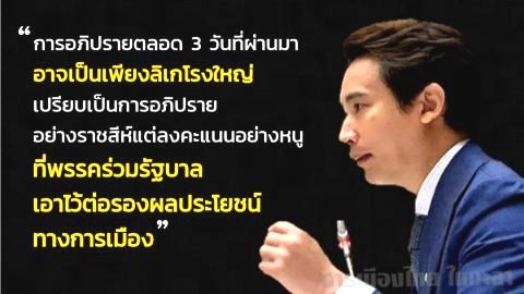 'พิธา' เปรียบพรรคร่วมรัฐบาลเล่นลิเกโรงใหญ่ต่อรองผลประโยชน์ อภิปรายอย่างราชสีห์แต่ลงคะแนนอย่างหนู