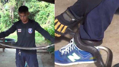 เกือบไปแล้ว..แม่บ้านโดนงูเห่าตัวเขื่องเลื้อยพันแขนขณะทำความสะอาดบ้าน