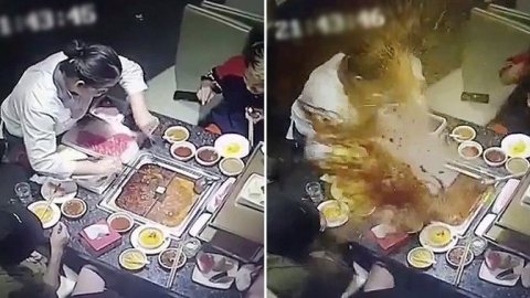 สยอง!! นาทีหม้อไฟระเบิดใส่หน้า พนักงานคีบหาไฟแช็กให้ลูกค้าในหม้อ โดนลวกสาหัส (คลิป)