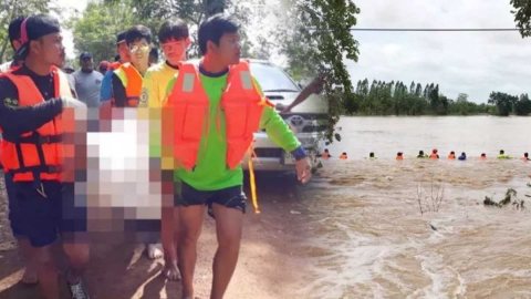 สองสามีภรรยาขับรถจักรยานยนต์ฝ่าน้ำท่วม ถูกกระแสน้ำพัดจมเสียชีวิต