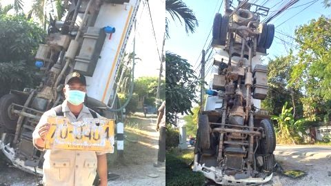 ชาวบ้านตะลึง! รถดูดส้วม ท้ายรถตีลังกาพาดกับเสาไฟฟ้า