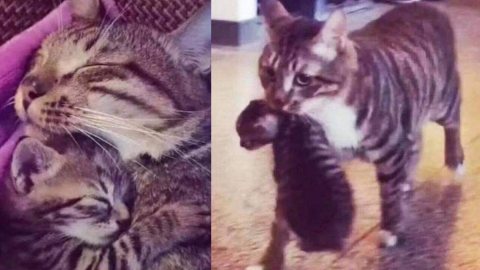แมวตัวผู้ คาบลูกมาหน้าเหมือนกันเด๊ะ คาดว่าคงเลิกกับเมีย แล้วแบ่งลูกกันเลี้ยง