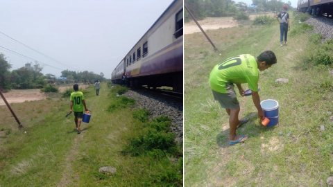 นี่และน้ำใจไทย หนุ่มเสื้อเขียวเดินหิ้วกระติกน้ำไปให้คนบนขบวนรถไฟที่กำลังจอดเสีย