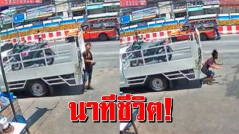 นาทีกระบะบรรทุกถอยอย่างไว พุ่งชนชายหนุ่มยืนดื่มน้ำ กระเด็นตะเกียกตะกายหนีสุดชีวิต