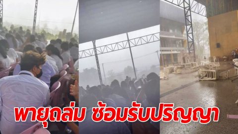 กริ๊ด!! บัณฑิตซ้อมรับปริญญา เจอพายุฝนถล่มเละ เก้าอี้ลอยได้