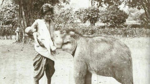 ลูกช้างกำพร้ากำลังดูดนมผู้หญิงแม่ลูกอ่อน พ.ศ. 2446 สมัยรัชกาลที่5