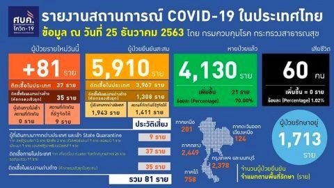 สถานการณ์การติดเชื้อ COVID-19 ผู้ป่วยรายใหม่ 81 ราย "ติดเชื้อในประเทศ 37 ราย" (25 ธ.ค. 63)