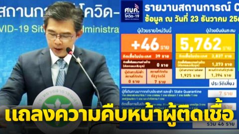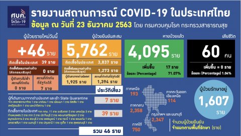 ยอดโควิด 23 ธ.ค.63 ติดเชื้อรายใหม่ 46 ราย จากในประเทศ 39 ราย ต่างประเทศ 7 ราย