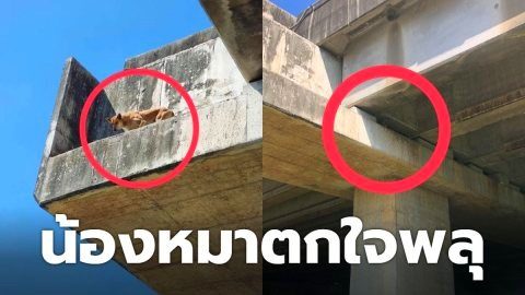 ขึ้นไปได้ไงเนี่ย!? หมาตกใจพลุ ติดอยู่บนตอม่อทางด่วน