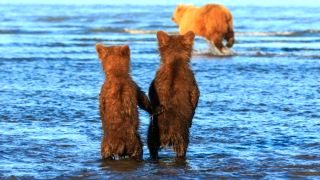 น่ารักม๊ากๆๆ ลูกหมียืนจับมือกันอยู่ริมฝั่งแม่น้ำ ยืนดูแม่หมีที่กำลังหาปลามาให้กิน