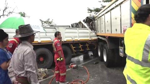 ยักษ์ปะทะยักษ์ รถ18ล้อ เบรกกะทันหันทำให้พ่วงท้ายไปชนกับรถ10ล้อ มีผู้เสียชีวิตทันทีติดภายใน