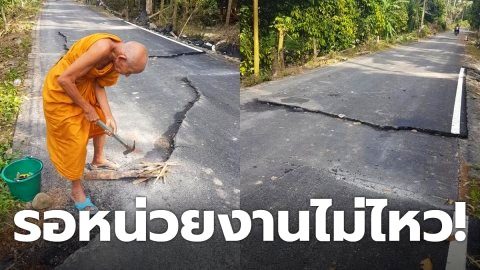 หลวงพ่อทนไม่ไหว! ลงมือซ่อมถนนเอง หลังยุบเป็นหลุม หวั่น! เกิดอันตรายกับญาติโยมที่ขับไปวัด