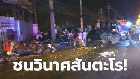 ชนสนั่นระยอง!! เก๋ง ชนกระบะป้ายแดง หงายท้อง กวาดเรียบจยย. รวม 36 คัน