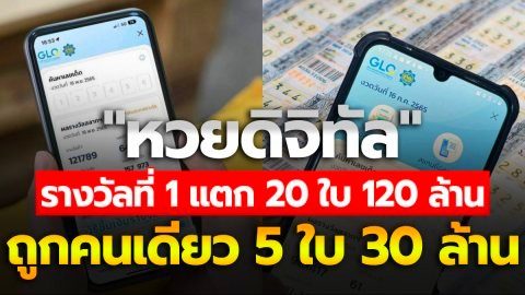 ใครหนอ! ถูก "หวยดิจิทัล" รางวัลที่หนึ่ง แตก 20 ใบ 120 ล้าน ถูกคนเดียว 5 ใบ 30 ล้าน