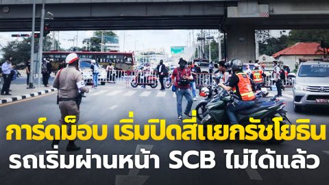 การ์ดผู้ชุมนุม นำแผงเหล็กกั้นปิดถนนบริเวณสี่แยกรัชโยธินมุ่งหน้าผ่านอาคาร SCB รถยนต์วิ่งผ่านมาทางหน้า SCB ไม่ได้แล้ว