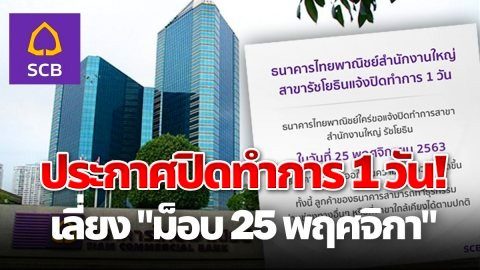 SCB สำนักงานใหญ่ รัชโยธิน ประกาศปิดทำการ 1 วัน! เลี่ยง "ม็อบ 25 พฤศจิกา"