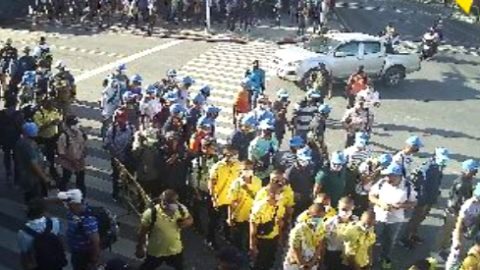 พบบุคคลจำนวนมากสวมใส่ชุดไปรเวท สวมหมวกสีฟ้า บางส่วนสวมเสื้อเหลือง เคลื่อนกำลังไป สนง.ทรัพย์สินฯ