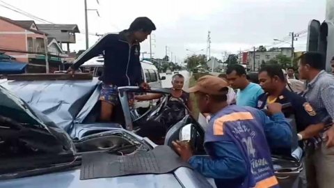 รถกระบะเสียหลักพุ่งชนเสาไฟอย่างแรง พ่อเสียชีวิต แม่และลูกบาดเจ็บ