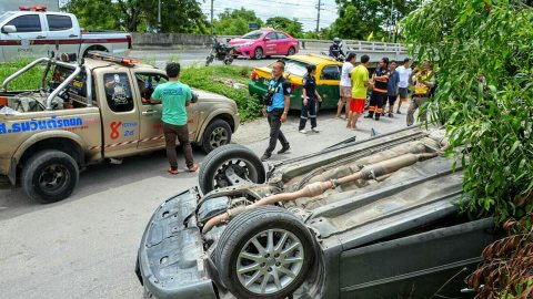 รถเก๋งเฉี่ยวแท็กซี่ย้อนศรคอสะพานพลิกคว่ำถนนปทุมธานี-ลาดหลุมแก้ว