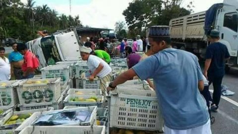 มันต้องอย่างนี้สิ รถผลไม้ประสบอุบัติเหตุ แต่โชคดีไม่มีคนขโมย มีแต่คนมาช่วยเหลือ