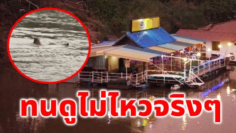 หนุ่มใส่เสื้อลายทหาร นั่งกินข้าวบนแพ ก่อนเห็นความผิดปกติ จนต้องรีบกระโดดลงไปในแม่น้ำ