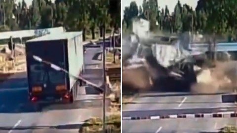 ระทึก! รถบรรทุกเข้าไปถูกขังในไม้กั้นรางรถไฟ แต่คนขับกลับไม่ฝ่าไม้กั้นออกไป