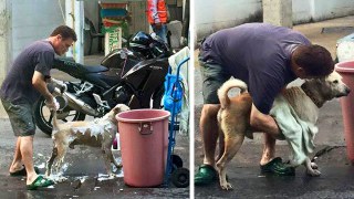 ภาพน่ารัก...ฝรั่งเข็นน้ำจากคอนโด เพื่อมาอาบน้ำให้หมาจรจัด !