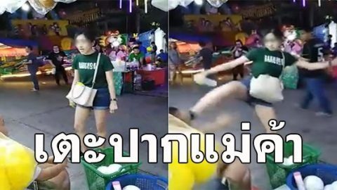 ไม่จบ!!ดราม่าปาแก้ว! ลูกค้าสาวไม่ยอมจบ บุกเตะปากแม่ค้ากลางงานวัด