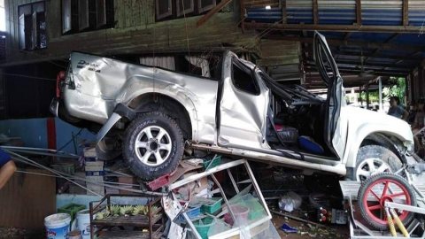 รถกระบะเสียหลักหลุดโค้งพุ่งชนบ้านเรือนประชาชน