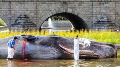 เหมือนจนตกใจ! ซากวาฬยักษ์เกยตื้นแม่น้ำกลางเมืองหลวงสเปน