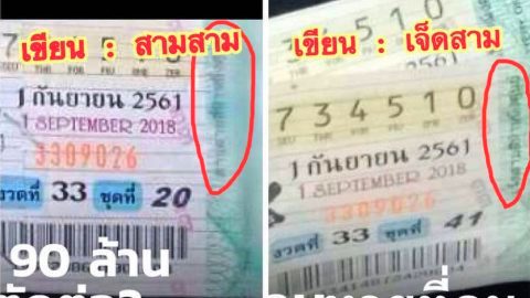เพจดังเผยอีก!! หวย 90 ล้าน!! มาดูภาพนี้กันลายน้ำในแถบสีเขียวแนวนอนรูปซ้าย เขียนว่า สามสามสี่ห้าหนึ่งศูนย์