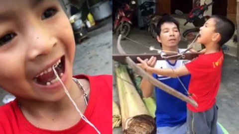 ทำไปได้!! เมื่อคุณพ่อพาลูกน้อย ใช้ปืนผาหน้าไม้ “ถอนฟัน” บอกได้คำเดียวว่าลุ้นจริงๆ