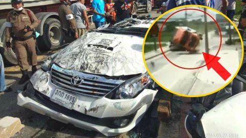 อีกแล้ว!! คลิปวินาที รถพ่วง 18 ล้อตะแคงล้มทับฟอร์จูนเนอร์จนแบน คนขับรอดตายปาฏิหาริย์